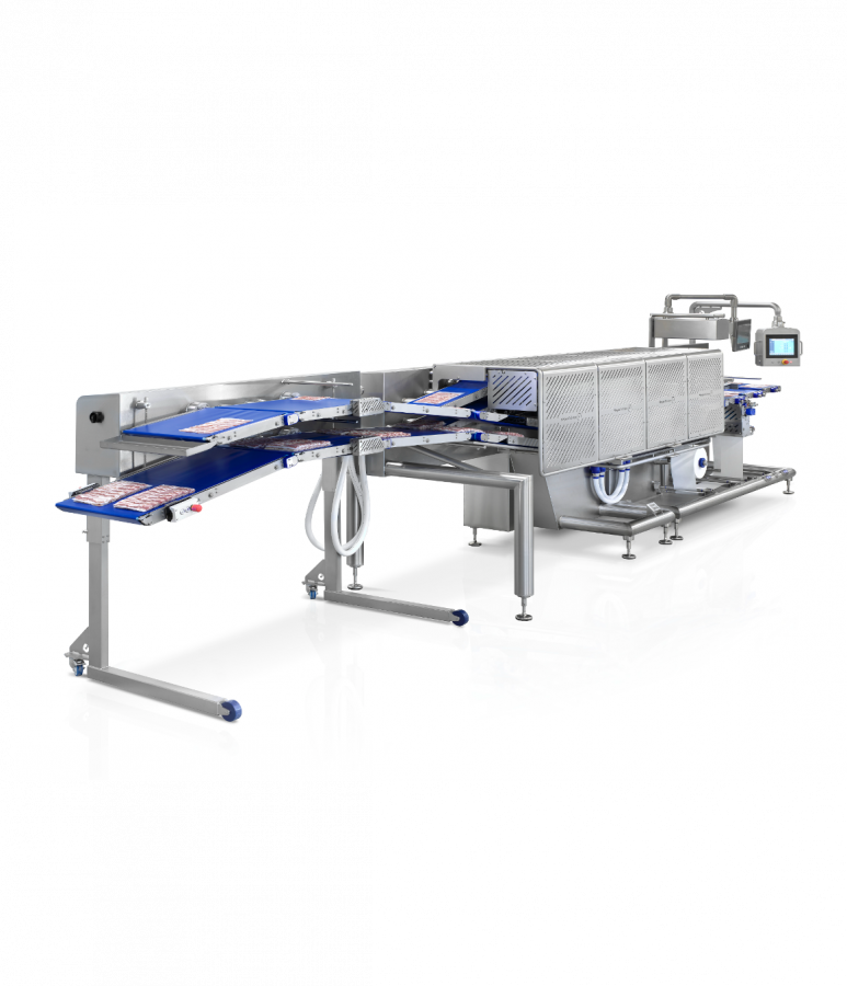 The Dual lane bacon line is specially developed for the bacon industry. Two seperate product line are being scanned, underleaved and piled. Beautiful stacks with eight slices of bacon per sheet in a fully automatic process. Single or double lines are absolutely a possibility. This line is suitable for layout bacon and standup bacon.
